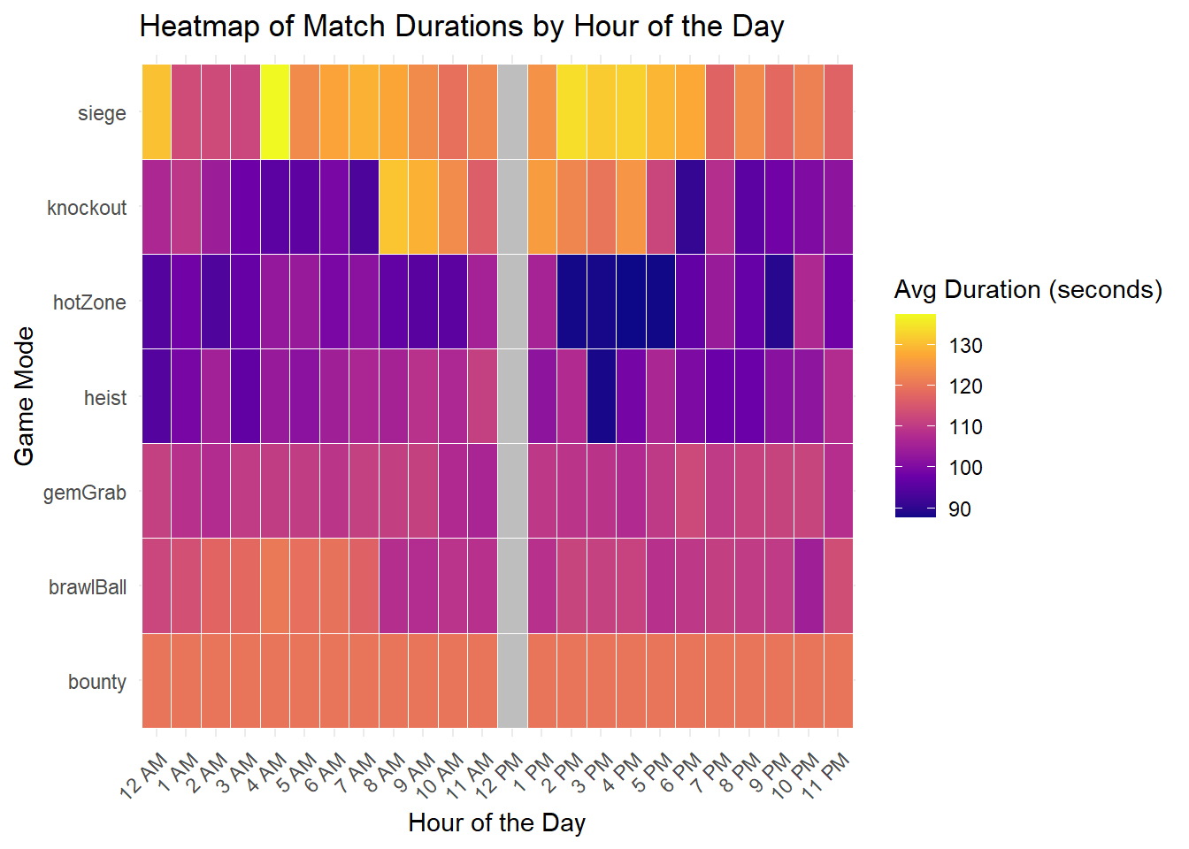 # extract hourdata <- data |>mutate(hour_24 =as.integer(substr(battle_time, 10, 11)), hour_12 =ifelse(hour_24 ==0, 12, hour_24 %%12), # convert to 12h formatperiod =ifelse(hour_24 <12, 'AM', 'PM'), # add am/pmhour_am_pm =paste(hour_12, period)) # fix labels# remove rows with missing or malformed battle_time valuesdata <- data |>filter(!is.na(hour_am_pm) &!is.na(battle_duration))data <- data |>mutate(hour_am_pm =factor(hour_am_pm, levels =c('12 AM', paste(1:11, 'AM'), '12 PM', paste(1:11, 'PM'))))data <- data |>filter(!is.na(hour_am_pm) &!is.na(battle_duration) &!is.na(battle_mode))# average match duration by hour and battle modematch_duration_heatmap <- data |>group_by(hour_am_pm, battle_mode) |>summarise(avg_duration =mean(battle_duration, na.rm =TRUE), .groups ='drop')# fill up the complete grid of all hours and modescomplete_grid <-expand.grid(hour_am_pm =factor(c('12 AM', paste(1:11, 'AM'), '12 PM', paste(1:11, 'PM')), levels =c('12 AM', paste(1:11, 'AM'), '12 PM', paste(1:11, 'PM'))),battle_mode =unique(data$battle_mode))# merge the complete grid with the actual datamatch_duration_heatmap <- complete_grid |>left_join(match_duration_heatmap, by =c('hour_am_pm', 'battle_mode'))# plot the heatmapggplot(match_duration_heatmap, aes(x = hour_am_pm, y = battle_mode, fill = avg_duration)) +geom_tile(color ="white") +# change gridlinesscale_fill_viridis_c(option ="plasma", na.value ="gray") +# set NAs to graylabs(title ='Heatmap of Match Durations by Hour of the Day',x ='Hour of the Day',y ='Game Mode',fill ='Avg Duration (seconds)') +theme_minimal() +theme(axis.text.x =element_text(angle =45, hjust =1))