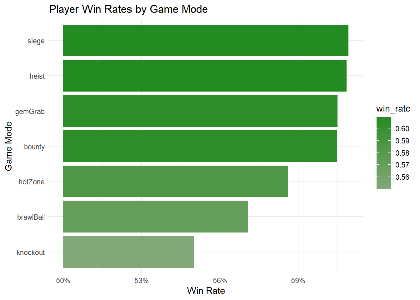 # win rates by game modewin_rates <- data |>group_by(battle_mode) |>summarise(win_rate =mean(battle_result =="victory"), .groups ='drop')# visualize win rates as a diverging chartggplot(win_rates, aes(x =reorder(battle_mode, win_rate), y = win_rate -0.5, fill = win_rate)) +geom_bar(stat ='identity') +scale_fill_gradient2(low ="red", mid ="gray", high ="forestgreen", midpoint =0.5) +coord_flip() +labs(title ='Player Win Rates by Game Mode',x ='Game Mode',y ='Win Rate' ) +scale_y_continuous(labels =function(y) paste0(50+ y *100, "%") ) +theme_minimal()