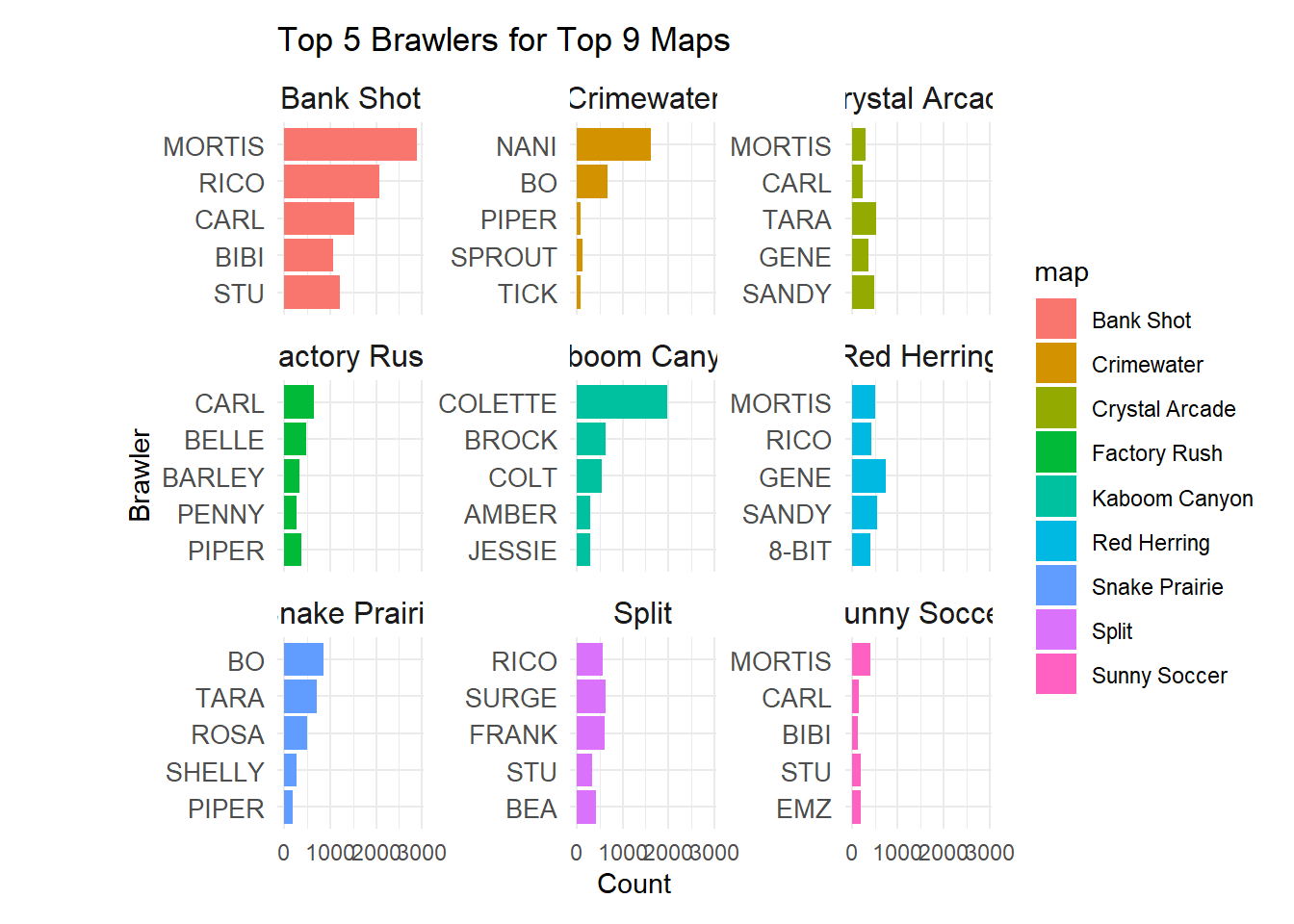 # calculate map usage frequenciesmap_usage <- data |>group_by(map) |>filter(map !='') |>drop_na() |>summarise(count =n(), .groups ='drop') |>arrange(desc(count)) |>slice_head(n =9) # grab top 9# filter data for only the top 9 mapstop_map_data <- data |>filter(map %in% map_usage$map)# group by map and brawler, limit to top 5 brawlers per mapbrawler_usage <- top_map_data |>group_by(map, star_player_brawler_name) |>summarise(count =n(), .groups ='drop') |>arrange(map, desc(count)) |>group_by(map) |>slice_max(order_by = count, n =5)# plot the dataggplot(brawler_usage, aes(x =reorder(star_player_brawler_name, count), y = count, fill = map)) +geom_bar(stat ='identity') +coord_flip() +facet_wrap(~map, scales ='free_y') +theme_minimal() +#scale_fill_brewer(palette = 'Set3') + labs(title ='Top 5 Brawlers for Top 9 Maps',x ='Brawler',y ='Count' ) +theme(axis.text.y =element_text(size =10),strip.text =element_text(size =12),plot.margin =margin(10, 10, 10, 50) )