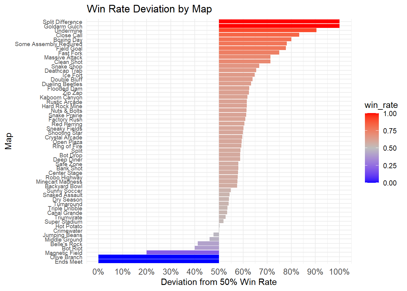 # calculate win rates for each mapmap_win_rate <- data |>filter(map !='') |>drop_na() |>group_by(map) |>summarise(win_rate =mean(battle_result =="victory"), .groups ='drop')# visualize win rate deviationggplot(map_win_rate, aes(x =reorder(map, win_rate), y = win_rate -0.5, fill = win_rate)) +geom_bar(stat ='identity') +coord_flip() +scale_fill_gradient2(low ="blue", mid ="gray", high ="red", midpoint =0.5) +scale_y_continuous(labels =function(x) scales::percent(x +0.5),breaks =seq(-0.5, 0.5, 0.1)) +labs(title ='Win Rate Deviation by Map', x ='Map', y ='Deviation from 50% Win Rate') +theme_minimal() +theme(axis.text.y =element_text(size =7),axis.text.x =element_text(size =10))