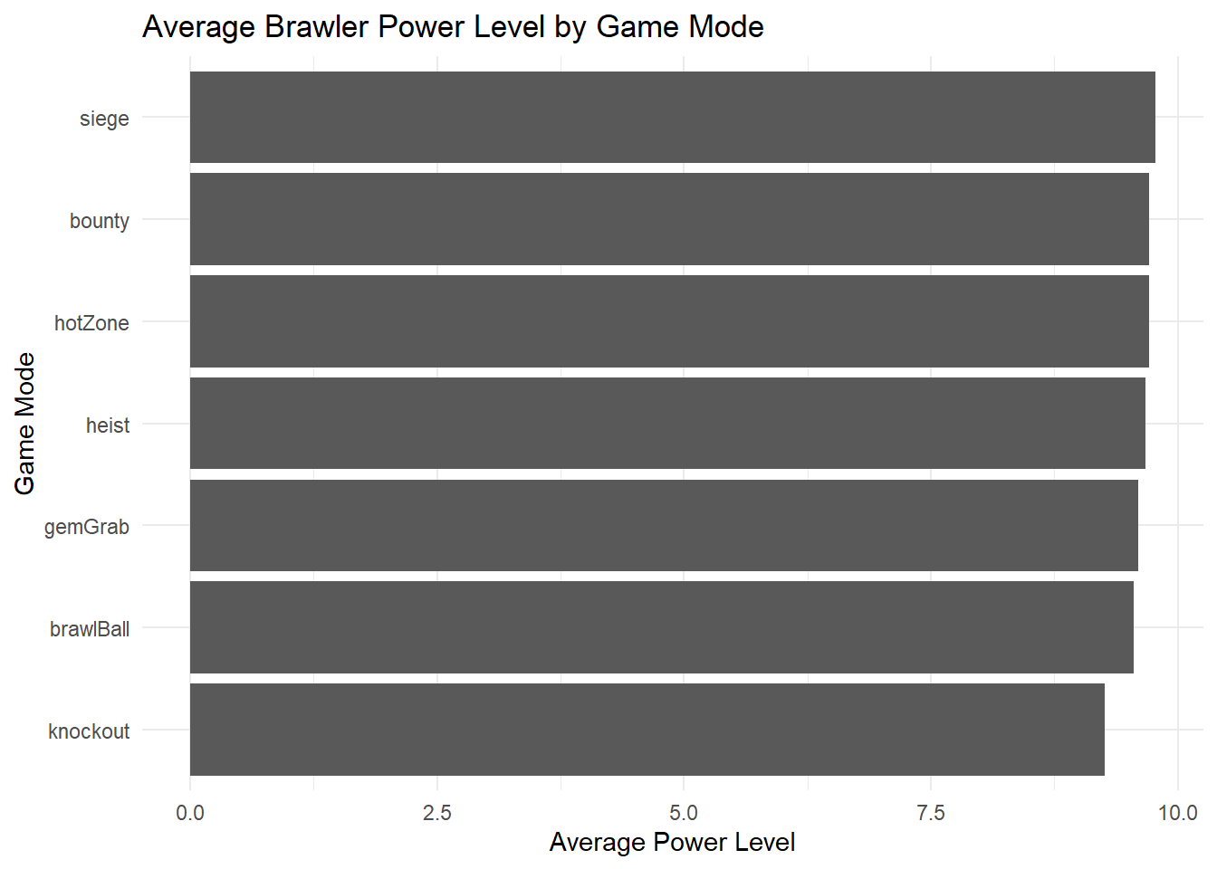 power_levels <- data |>select(battle_mode, contains("_brawler_power")) |>pivot_longer(cols =starts_with("team"), names_to ="player", values_to ="power_level") |>group_by(battle_mode) |>summarise(avg_power_level =mean(power_level, na.rm =TRUE), .groups ='drop')ggplot(power_levels, aes(x =reorder(battle_mode, avg_power_level), y = avg_power_level)) +geom_bar(stat ='identity') +coord_flip() +labs(title ='Average Brawler Power Level by Game Mode', x ='Game Mode', y ='Average Power Level') +theme_minimal()