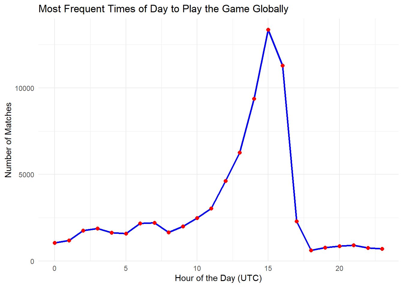 # extract the hour from battle_timedata <- data |>mutate(hour =as.integer(substr(battle_time, 10, 11)))# count matches by hourmatches_by_hour <- data |>group_by(hour) |>summarise(match_count =n(), .groups ='drop')# plot match frequency by hourggplot(matches_by_hour, aes(x = hour, y = match_count)) +geom_line(color ='blue', size =1) +geom_point(color ='red', size =2) +labs(title ='Most Frequent Times of Day to Play the Game Globally', x ='Hour of the Day (UTC)', y ='Number of Matches') +theme_minimal()